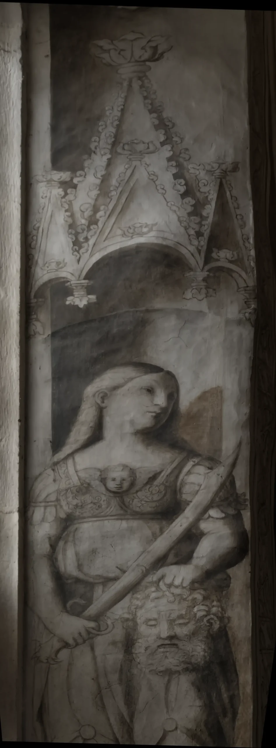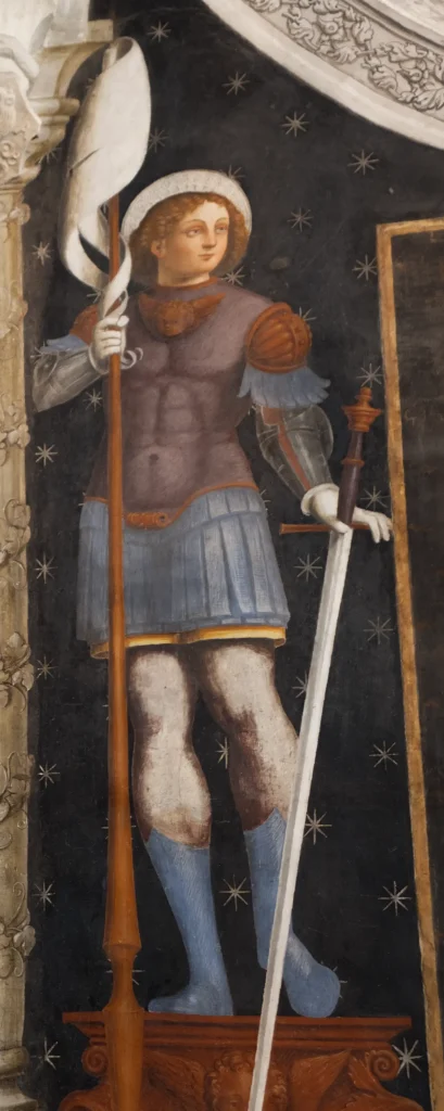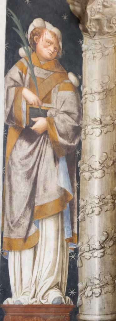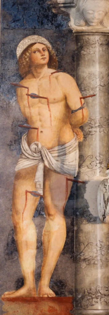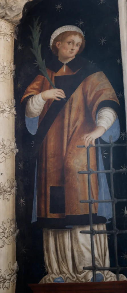 Madonna del latte, tra i santi Rocco a destra e San Grato a sinistra, affresco di ambito della bottega di famiglia, firmato da Giovanni Antonio Merli, cognato di Tommaso Cagnola, datato 1488.