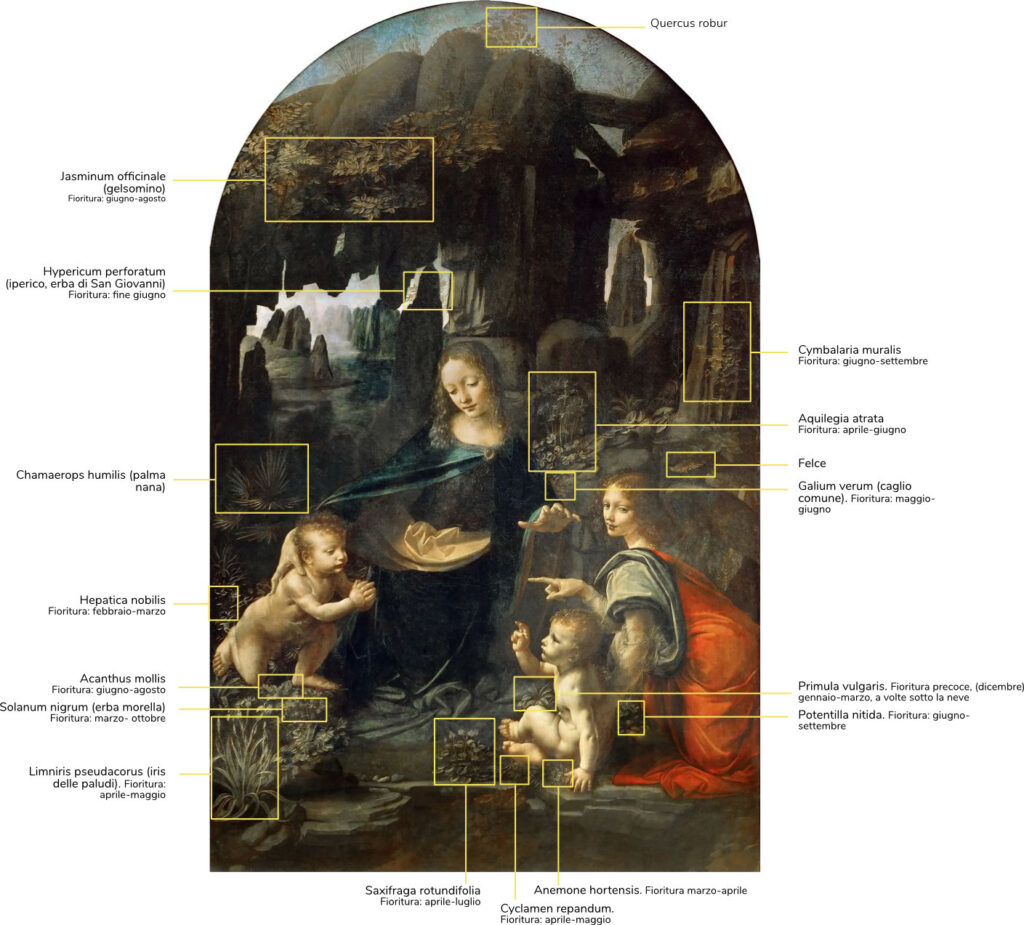 L’artista-scienzato ambienta la scena in un aprile di una primavera di vita e rinascita, dìmostrando di conoscere i periodi di fioritura, alle latitudini lombarde, delle specie rappresentate e dipinge senza fiori quelle a fioritura più precoce o tardiva. Luoghi che ha studiato con scrupolo e passione, e ai quali piaceva tornare: qualche anno dopo (forse intorno al 1490) proprio delle “montagne di Lecco” scrisse “Queste gite son da fare del mese di maggio” (CA 573v).