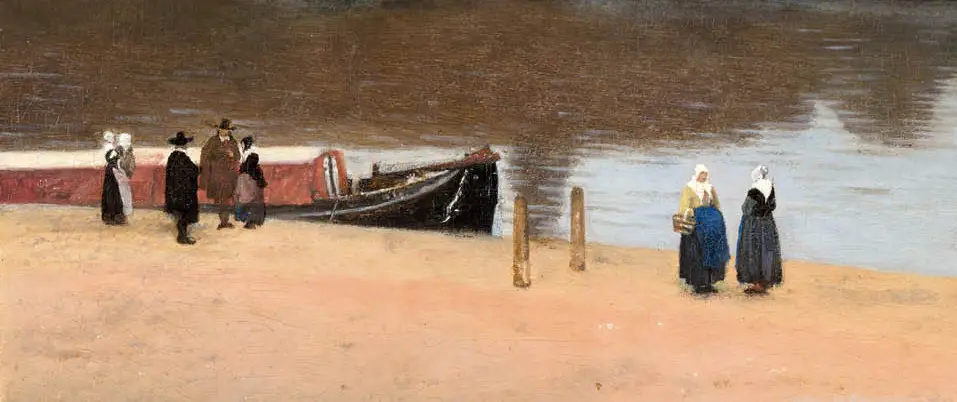 Osserviamo un dettaglio della famosa Veduta di Delft (1660-1661): una sciarada visuale composta da donne, due pali d’ormeggio e un piccolo gruppo di persone, probabilmente mercanti di fronte al battello dei loro traffici. Le due donne sulla riva sono immerse in una luce dorata di salvezza, avvolte dal suo velo di serena trasparenza e grazia.